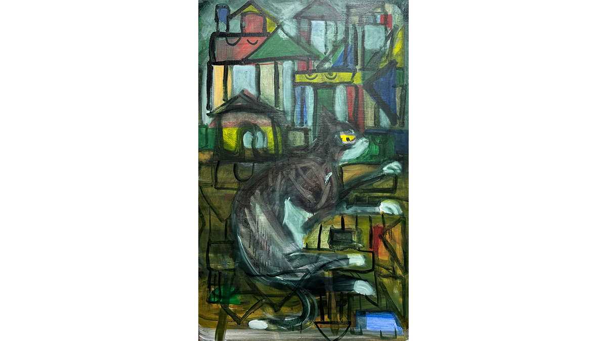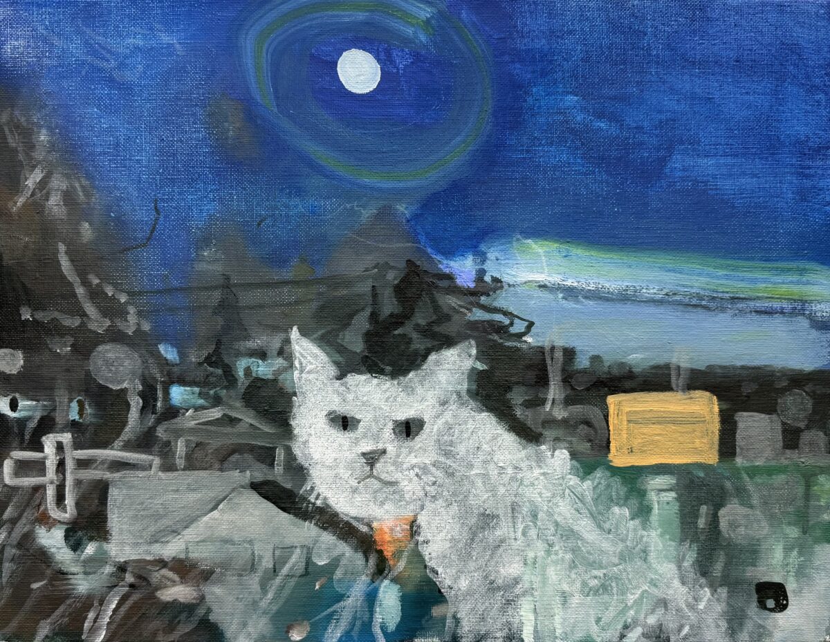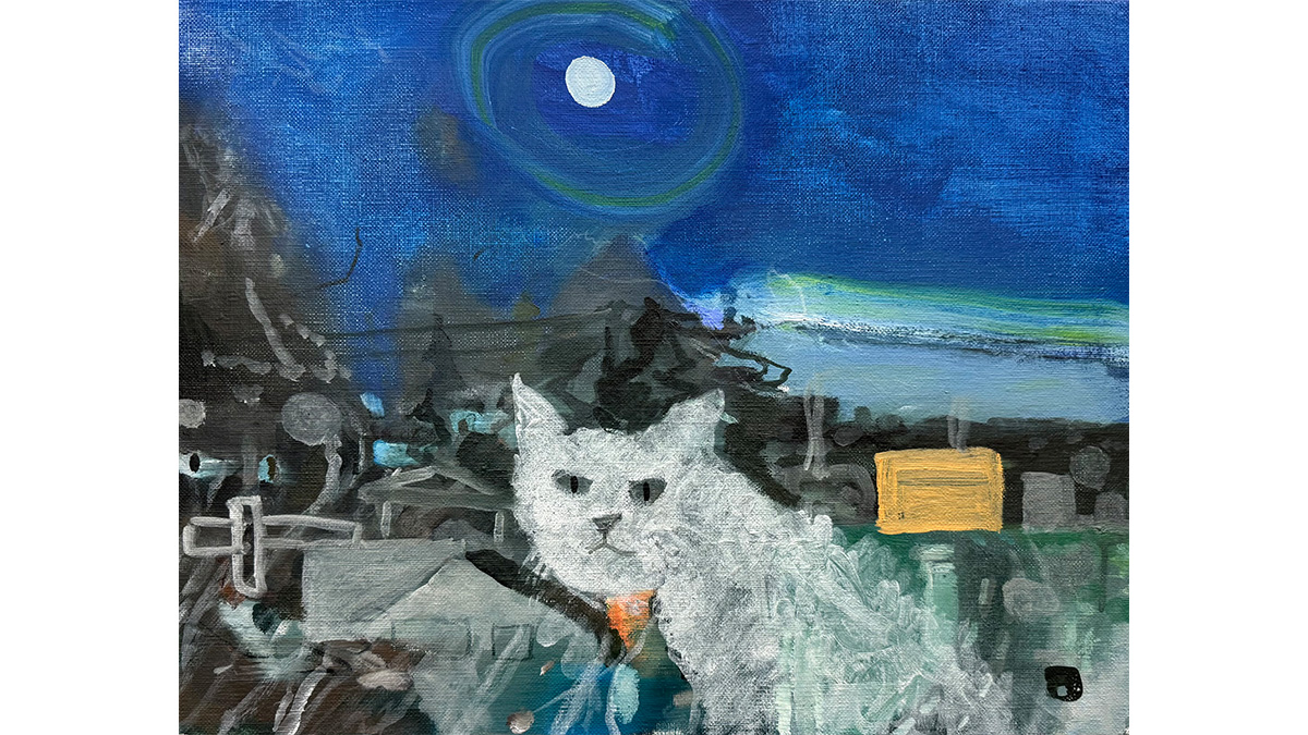 私は場所やもの、生き物が潜在的に持っているイメージ(土地柄や人柄など)を基に制作をしています。実際に見た景色からイメージを派生させ、絵の画面上で絵の具に転換する時 に生じるずれを意識して、試行錯誤を楽しむ気持ちで描いています。
